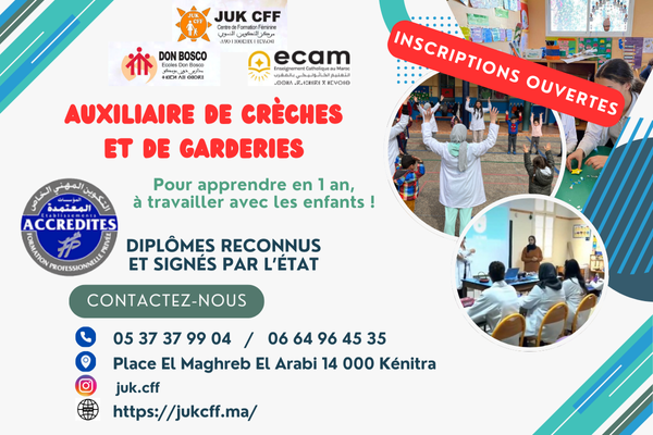 Les inscriptions sont encore ouvertes pour la formation d’Auxiliaire de Crèches et de Garderies au JUK CFF à Kénitra.