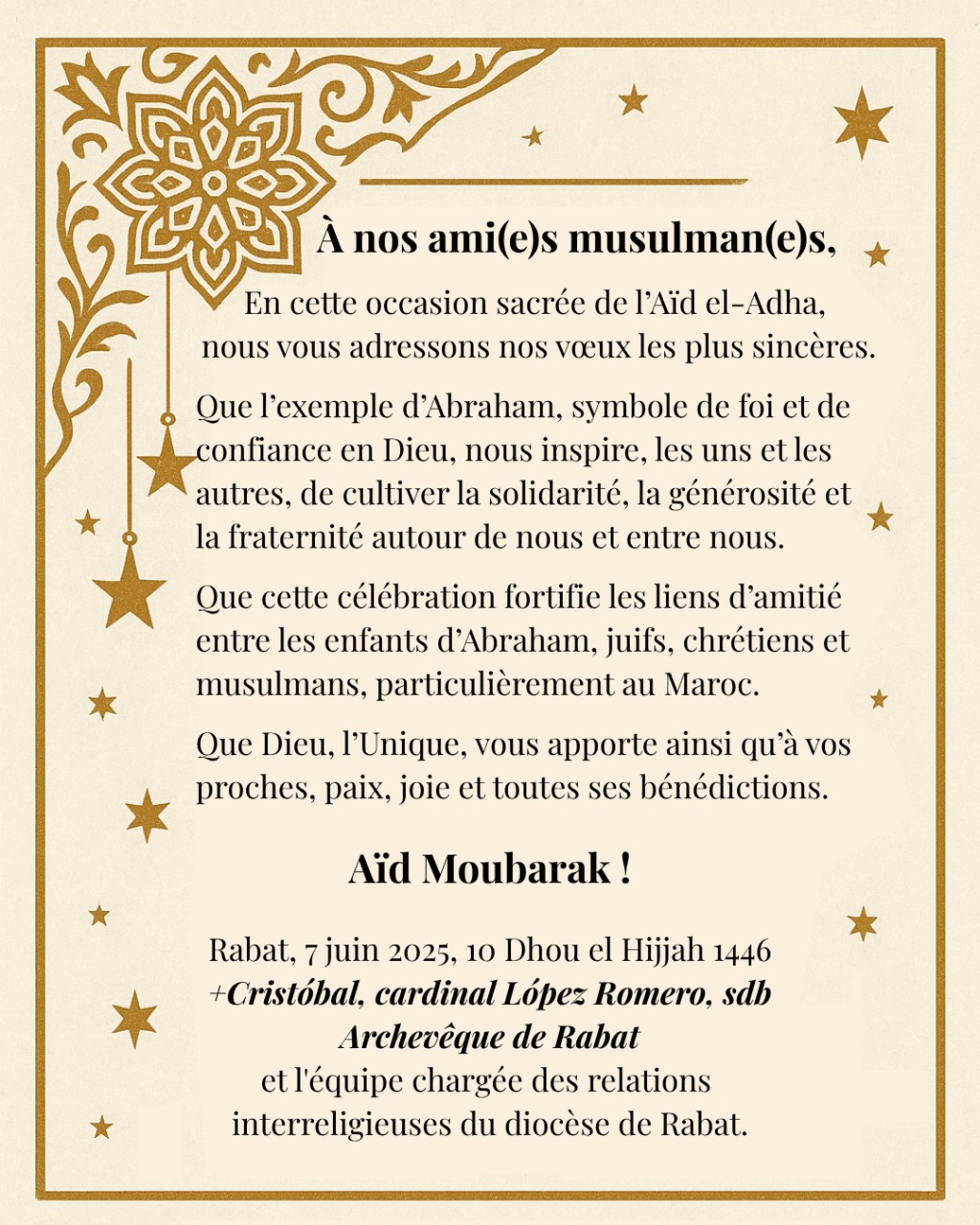 Le directeur, Père Miguel Bártulo Cortés, ainsi que toute l’équipe éducative, vous présentent leurs meilleurs vœux à l’occasion de l’Aïd Al Adha. Que cette fête vous apporte santé, réussite et bonheur et vous permette de partager des moments de joie et de sérénité avec vos proches et vos amis..